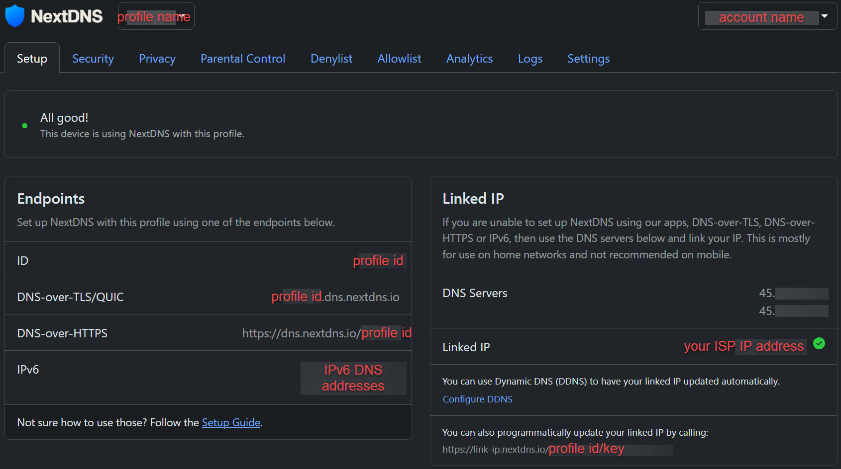 Each profile comes with its own separate configuration (a combination of DNS server IP addresses and the profile ID) that you can use on the devices you want to associate it with. You have several options for configuring devices to use a NextDNS profile: DoT, DoH, IPv6, and linked IP (which typically would be the IP address of your ISP connection). Also included on the setup page are detailed instructions on how to set up each option on a variety of devices (Android, iOS, Windows, macOS, Linux, ChromeOS, browsers, and routers).