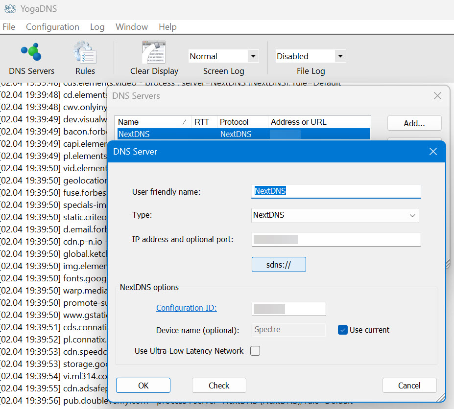 Similarly, there are apps for Windows and macOS you can install to cover your laptop when not on the home network. Like the mobile app it’s pretty simple to install and then just fill in the custom profile ID and you’re good to go. During my testing, however, I found that sometimes even though the app said it was running, test.nextdns.io would indicate my laptop was using the ‘default’ DNS settings from my router. The pattern seemed to be if the laptop went to sleep and then I started using it again. Since I have NextDNS set up at the router level, DNS traffic was still going through NextDNS, but it wasn’t identifying my laptop as the client. To remedy this, I tried switching to the YogaDNS client instead. YogaDNS is another paid application, but the free version allows for a single DNS server and up to two rules which is fine for my needs (the Pro version for $40 lets you use unlimited DNS servers and rules and also run it in the background as a service which I guess is handy if you want to prevent people from closing it).