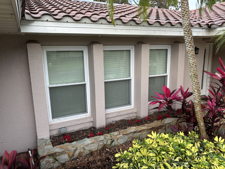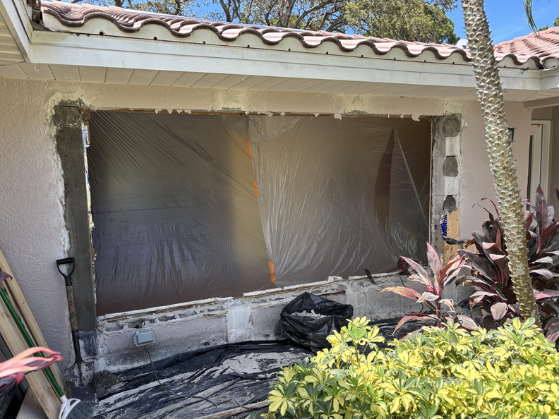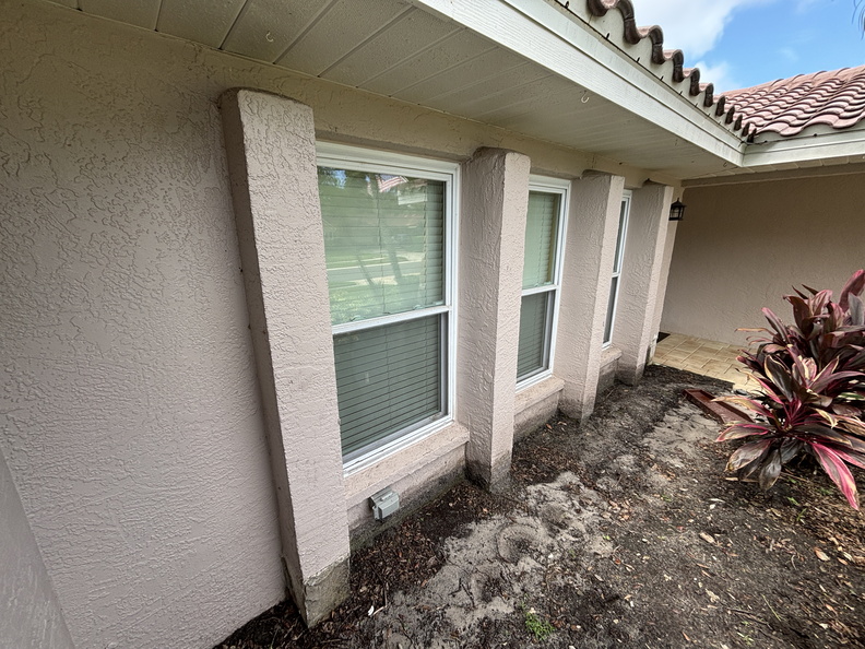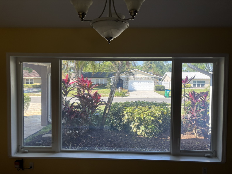 After the 2024 hurricane season we had two leaking windows in the front of the house. This wasn’t so much a failure of the windows themselves as the caulk/sealant around the windows, but we we had already been thinking about replacing all three of them with a big picture window and this was the final push we needed to start that project. In early April 2025, we found a contractor to handle the job: removing a raised, concrete wall flowerbed in front of the windows, knocking out the four concrete block “pillars” separating the three windows to create one large opening (11′ x 5′), and installing a picture window with two side casement windows. By late April, demolition of the flower box was complete but then we ran into a delay ordering the custom windows from Pella. The new windows arrived two months later at the contractor’s and the rest of the project was completed over a few days in mid-July.
