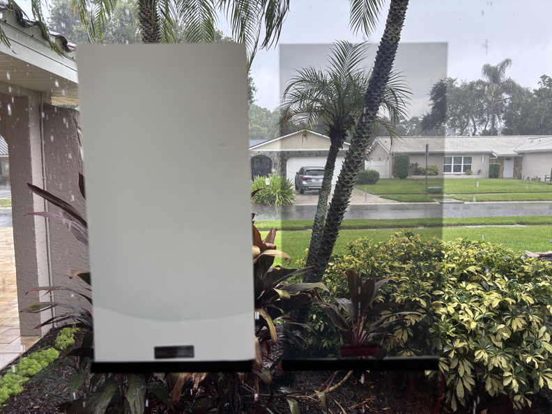 While waiting on the replacement, we began looking at our window covering options. On the original three windows we had had wood blinds, but that was no longer feasible due to the width of the opening (even with smart blinds, and we didn’t want to do curtains). Plantation shutters was our next option, but we didn’t like that when opened and folded up against themselves to either side of the window they would stick out and block the walkway around our dining room table. At one point I jokingly mentioned we should get that fancy electro-window tinting that turns on and off like in high-end conference rooms and my wife was like, why not? So we started researching that option and came across two smart film possibilities: SmartGlass Technologies and Smart Tint. After working with each vendor through some quotes, back-and-forth questions and answers, we selected Smart Tint. It was not only slightly cheaper in cost (although that ended up working against us, more on that later) but I really liked their sample kit that let us check out their various offerings at home. We ended up selecting the gray tint since the white had a slight yellow tinge when it was in “clear” mode (in the third photo below, look at sky just above my neighbor’s doorway and you’ll see what I mean) and there wasn’t that much of a difference inside or out when the film was in its opaque state.