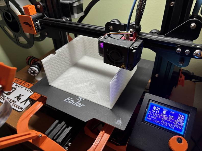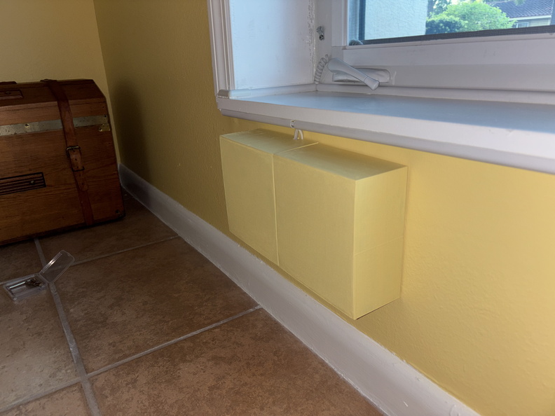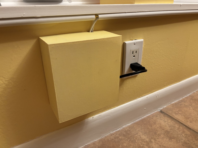 In the video and photo above, you can see the power supply under the bottom left corner of the window, plugged into the switched outlet. I wanted to cover it somehow so with a little help from Microsoft Copilot I designed and 3D printed a box to hide it. I made it in two parts so that one side could be easily removed to expose the outlet if needed (also because it was too big to print as one piece on my printer), and painted them to match the wall. I used strong magnets glued to each side to allow the two pieces to snap together. Each side was an 18-hour print, but I’m pretty happy with the end result: